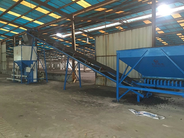 燃煤專用包裝機為型煤,潔凈煤,塊煤,煤球,潔凈型煤,燃煤等物料的定量包裝而設計。型煤包裝機采用皮帶輸送機給料,物料通過皮帶輸送機進入緩沖料倉,再經過皮帶給料自動控制物料輸送到稱料斗。通過變頻二段速控制給料量,稱料斗一旦到了預定重量停止供料。雙秤交替稱重。人工輔助夾口袋。料箱物料迅速落下,其夾袋器通過控制系統打開,料袋通過輸送帶送走,經立柱式縫包機封口。